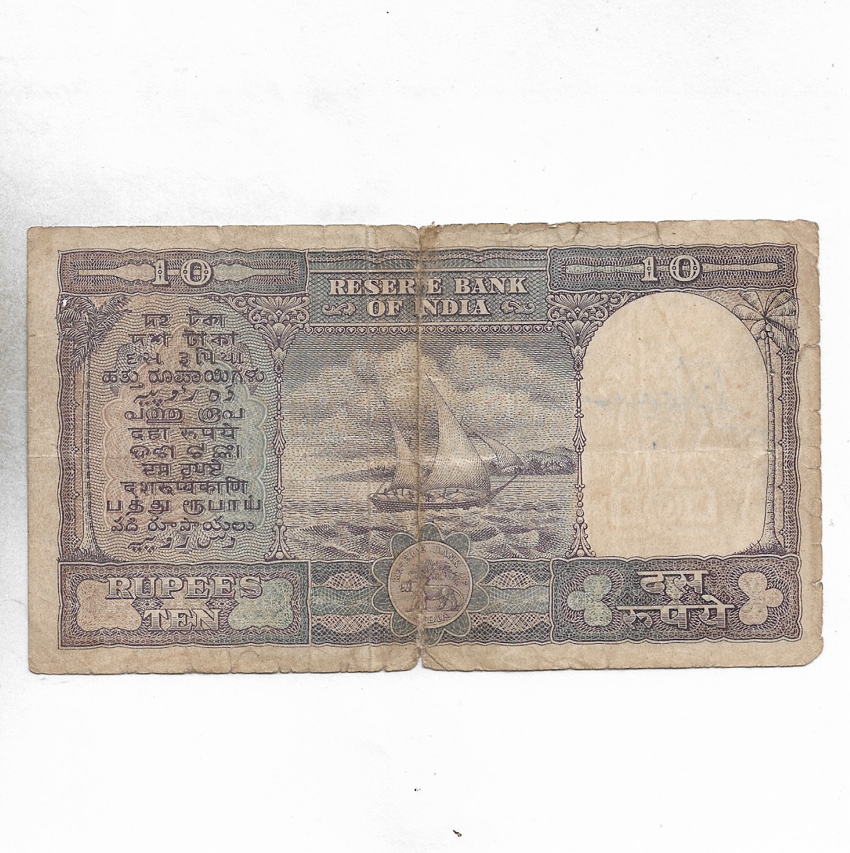 10 RUPEE ~ P.C.BATTACHARAYA ~ “V” PRIFIX, “B” INSET ~ SHIP ON BACK ( BIG NOTE ) ~ RARE NOTE ~ A-51