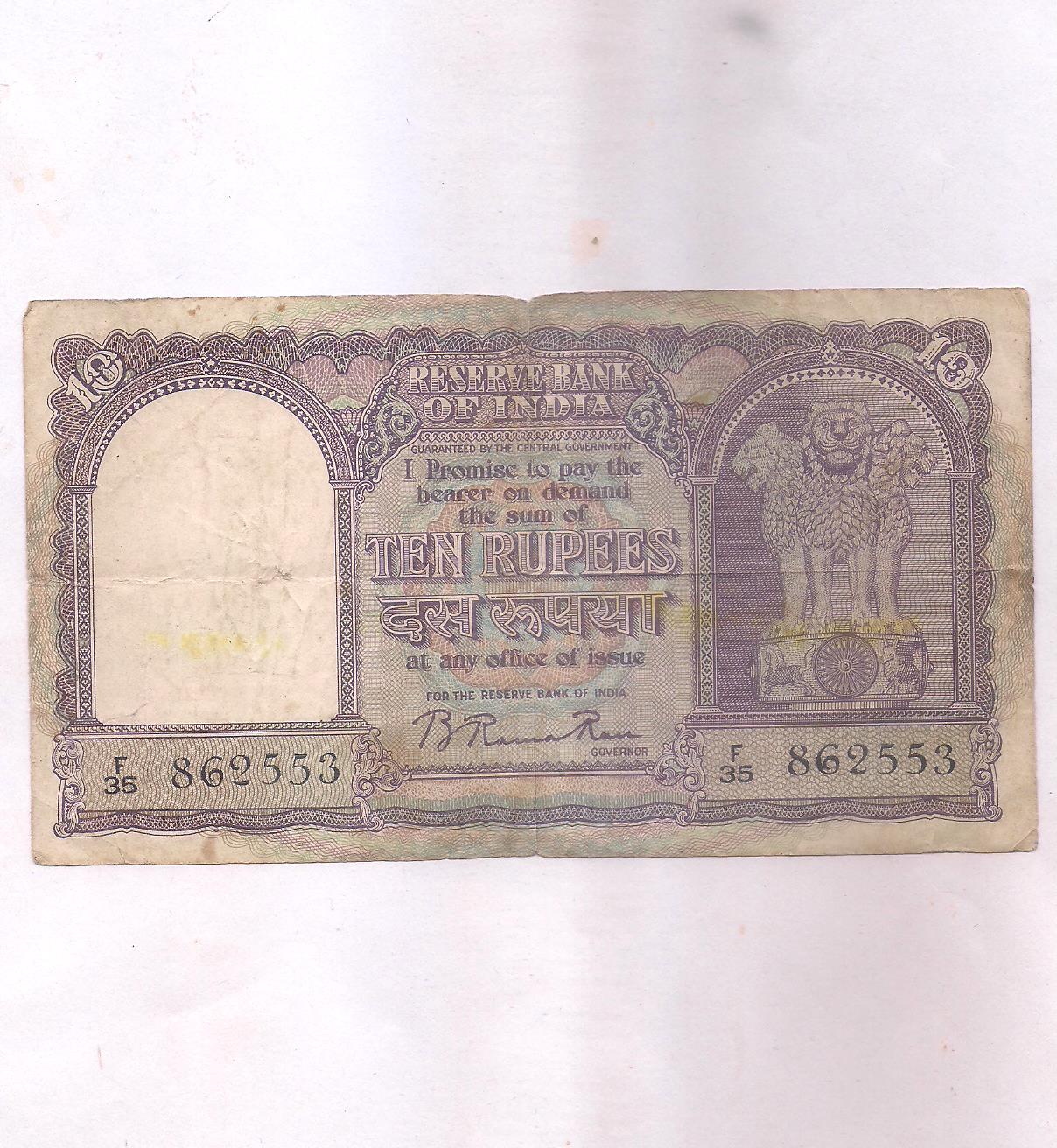 10 RUPEES ~ B.RAMA RAO ~ 2nd ISSUE ~ “F” PRIFIX, “PLAIN” INSET ~ RARE NOTE ~ F-7/23