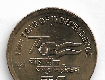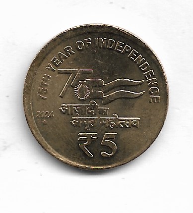 5 RUPEE ~ ERROR ( SHIFTING ) 75 YEARS OF INDEPENDENCE, 2024, NOIDA MINT ~ UNC RARE COIN ~ J-1