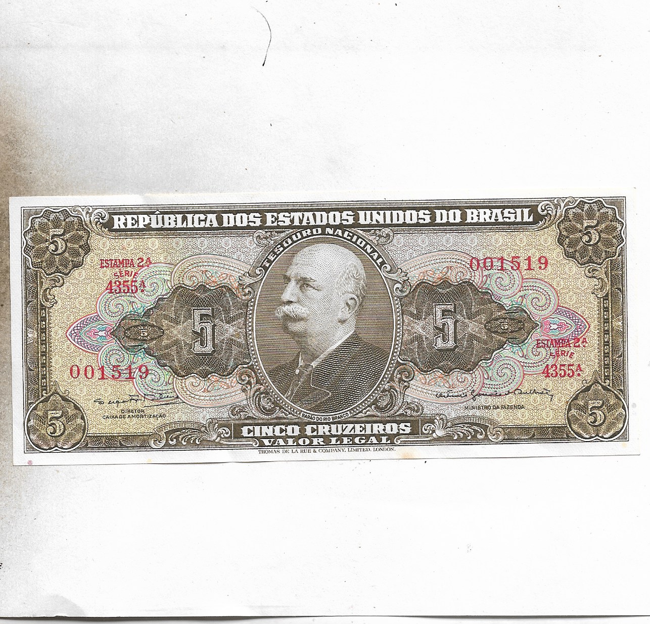 BRAZIL ~ 5 Cruzeiros Thesouro Nacional; 2nd print; “Valor Legal”, 1962 ~ RARE NOTE ~ F-6/17