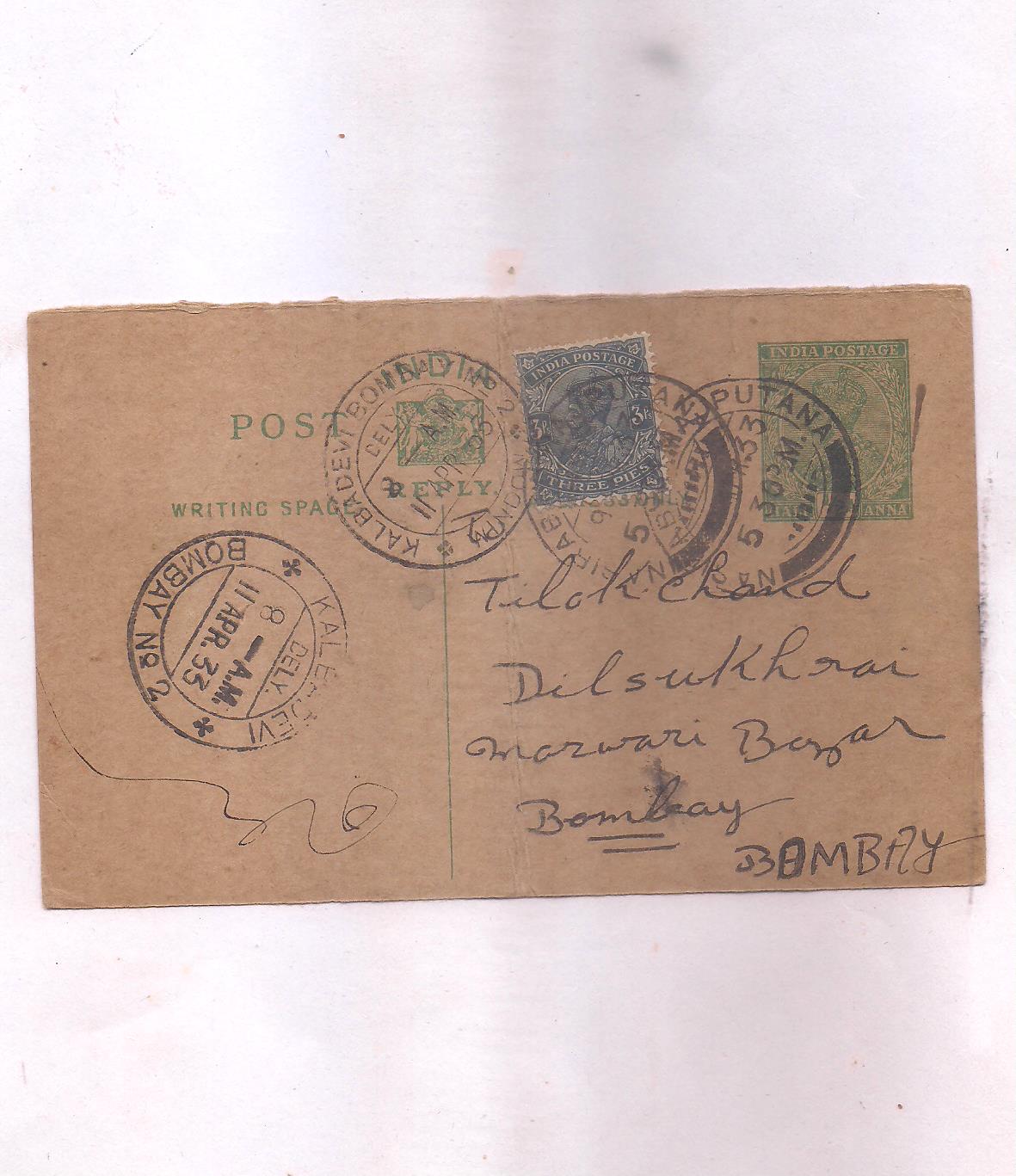 GEORGE V ~ 1/2 ANNA ( WITH STAMP ) ~ POSTCARD, 1933 ~ RARE ~ F-44