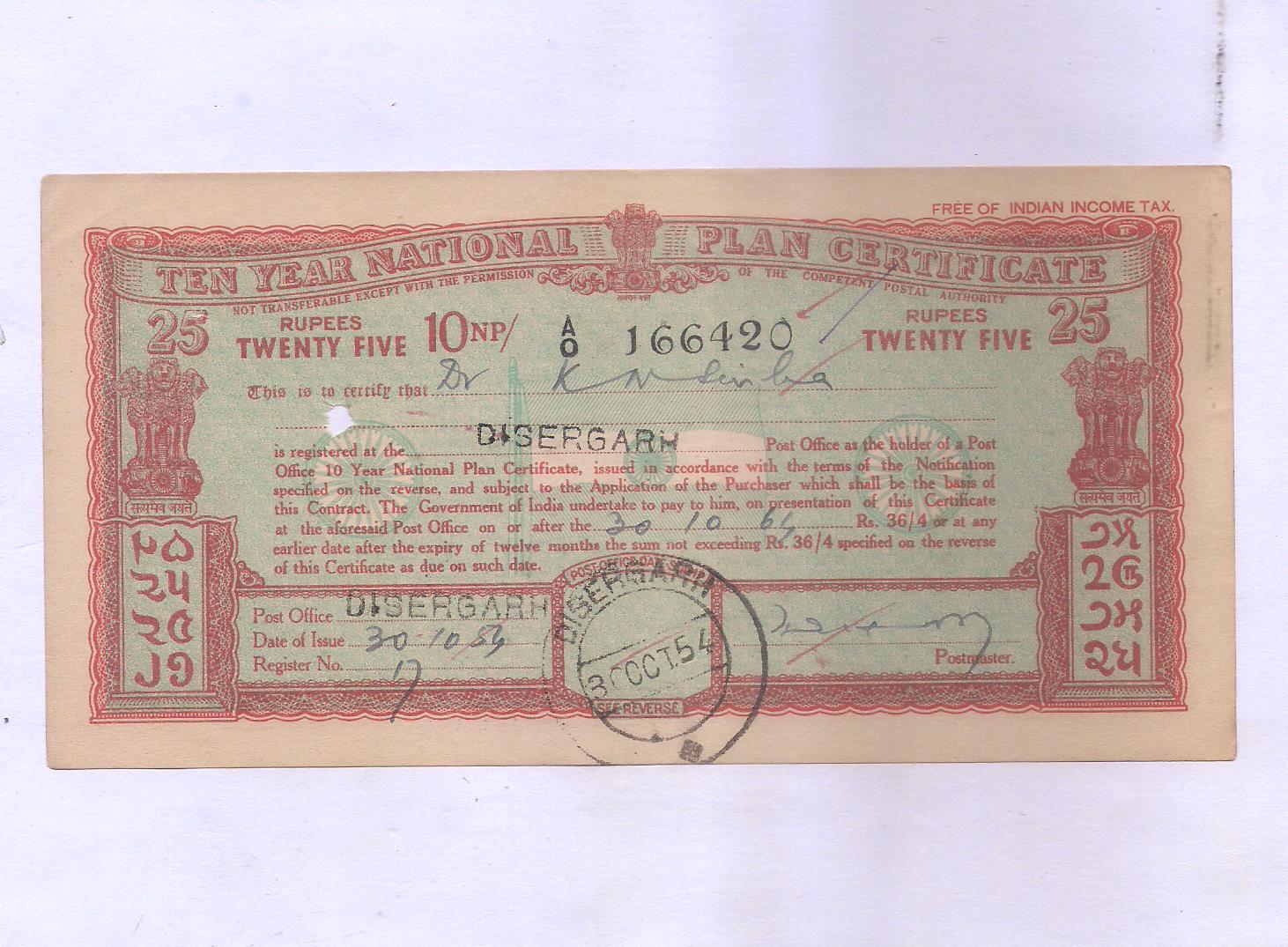 INDIA POST OFFICE ~10 YEAR NATIONAL PLAN CERTIFICATE ~ 25 RUPEES ~ RARE ~ E-47