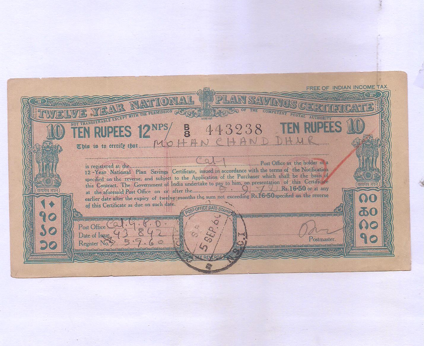 INDIA POST OFFICE ~ 12 YEAR NATIONAL PLAN SAVINGS CERTIFICATE ~ 10 RUPEES ~ RARE ~ F-21