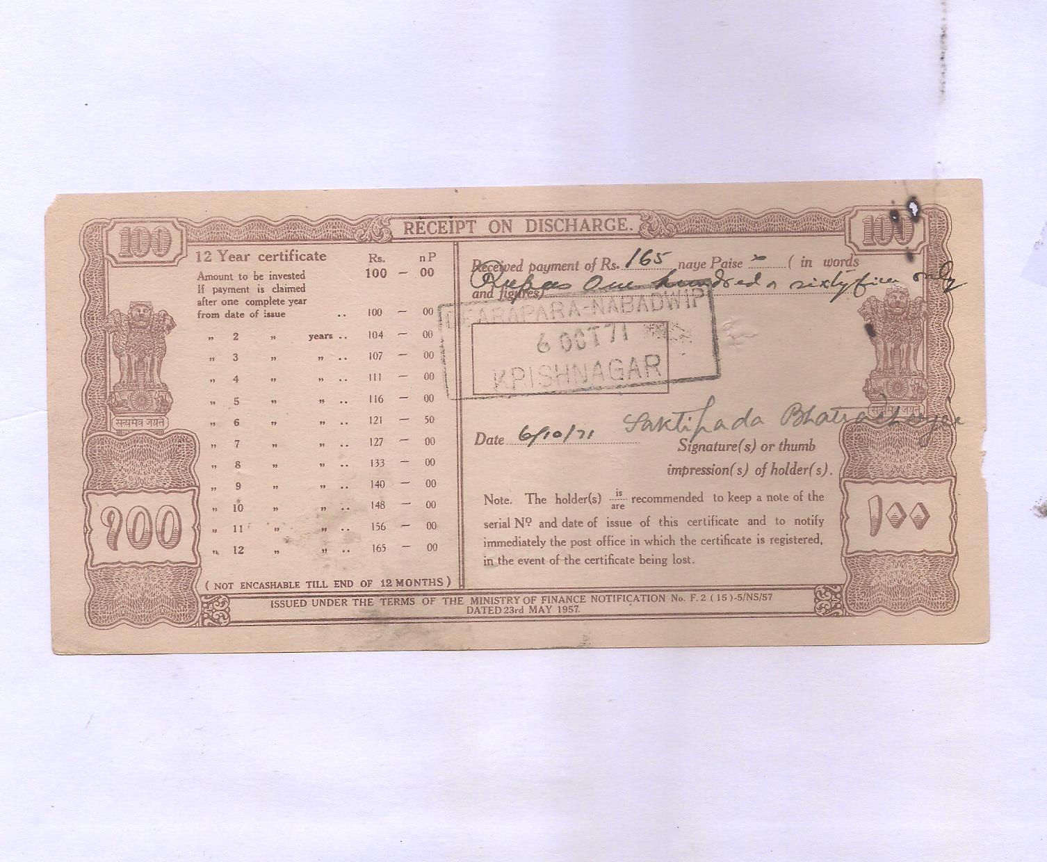 INDIA POST OFFICE ~12 YEAR NATIONAL PLAN SAVINGS CERTIFICATE ~ 100 RUPEES ~ RARE ~ F/3-15